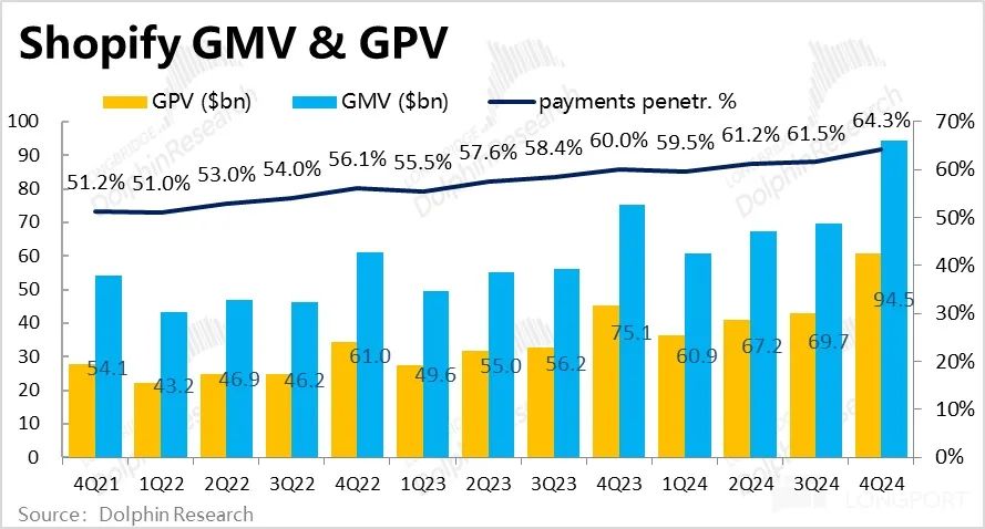 而本季度 GPV 金额为$607 亿,同比增长 34.7%,实际值高出市场预期 3.3%。Shopify 支付渗透率(即 GPV / GMV)达 64.3%,环比提升了约 280bps,大体符合上述的测算。