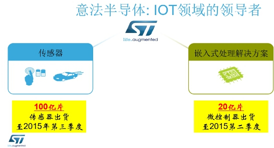 ST 作为唯一一家提供全系列传感器和微执行器的半导体公司,在物联网早已深耕多年。2015年ST整体的业绩与去年相比有了更大幅度的提高,传感器出货量截止到2015年第三季度已达到了100亿片,在嵌入式处理解决方案方面,微控制器出货量截止到2015年第二季度就达到了20亿片,这在同类企业中也是名列前茅的成绩。