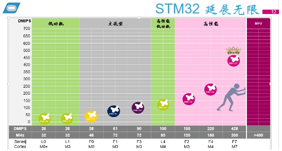 针对不同的应用需求,全线的STM32被分成:低功耗、主流型、高性能型三大类别。而具体的产品从低功耗到高性能分别被分成了九个品类:L0、L1、F0、F1、F3、L4、F2、F4、F7。各条产品线协同合作,在平台化思路下,可以更好地帮助用户找到适合自己产品的STM32-MCU。同时借助STM32的平台系统,将增值服务商、代理商、设计公司等领域内各个版块的专业人士汇聚于此,将帮助合作方更好地进行产品设计,加快设计进度。同时,ST也保证所有产品全部都是引脚兼容、外设兼容、软件兼容的。这一庞大的物联网生态系统,将使ST的合作伙伴更加快速便捷地开发产品,在这个快速变革的时代,时刻保持竞争力。