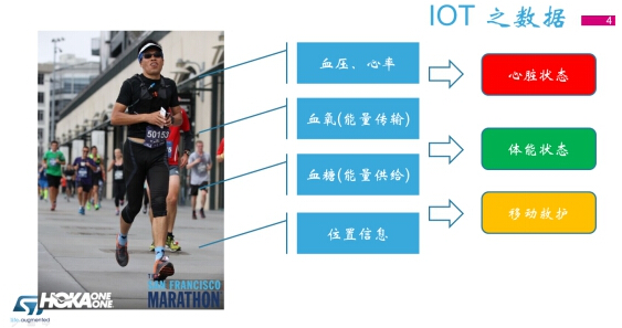 “我们不妨用一个健康管理的例子,来感受物联网将给我们生活带来的帮助。”于引女士随后用马拉松作为引子,将看似遥不可及的物联网拉到了我们的身边。马拉松是不少健身爱好的必选项目,然而马拉松也存在着自己的隐患,以2015年上海马拉松为例,出现1,123名身体不适者,32名重病患者。如果我们可以预知这些人群的身体状况,就可以降低参赛人群的风险,而这恰恰是物联网中可穿戴设备大有可为的地方。