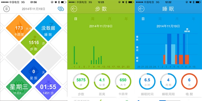 运动数据(步数)可以记录各个时间段步数以波形图显示,有步数、距离、卡路里、总活动时间、最长空闲时间段、最长活跃时间段组成。在这里可以有效的知道哪些时间段一直在活跃,久坐对身体不好,我们可以改掉这些坏习惯。使用下来应该是以手臂摆动或震动来记录步数。所以有时乘坐有震感的交通工具时也有可能被误认为运动,这点可能还需要精确一下比较好!