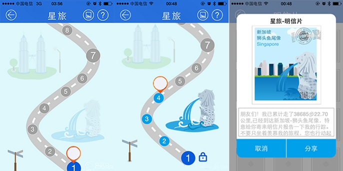 接下来我们体验STAR.21核心的“21天效应法则”了。APP内置了一个结合步数来玩的一个有趣的游戏,地图一路上好多国家的地方性建设。游戏初始根据本人身体情况建议一定步数作为一个星旅,完成这个目标就能向前一个星旅,而且还能拿明信片!星旅开启以后,须每天完成系统给出的目标,达标一天,星旅将点亮一天,当天偷懒或不达标,星旅就会倒退一天。