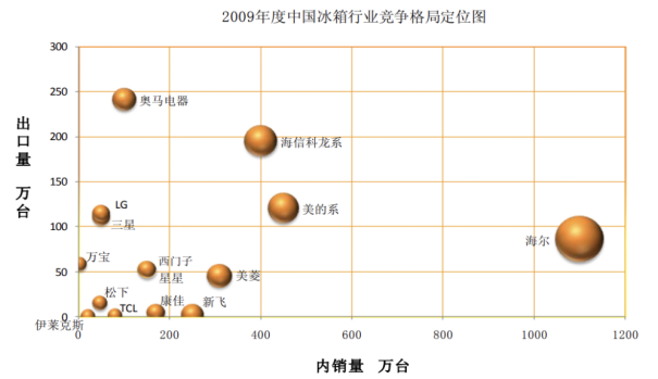 据《2009年中国冰箱行业研究报告》显示,2009年中国冰箱产业格局中,海尔占据绝对领先的市场地位,美的系(包括美的、荣事达、华凌及小天鹅四个子品牌)、海信科龙系(包括海信、科龙及容声三个子品牌)、美菱及TCL智家紧随其后。
