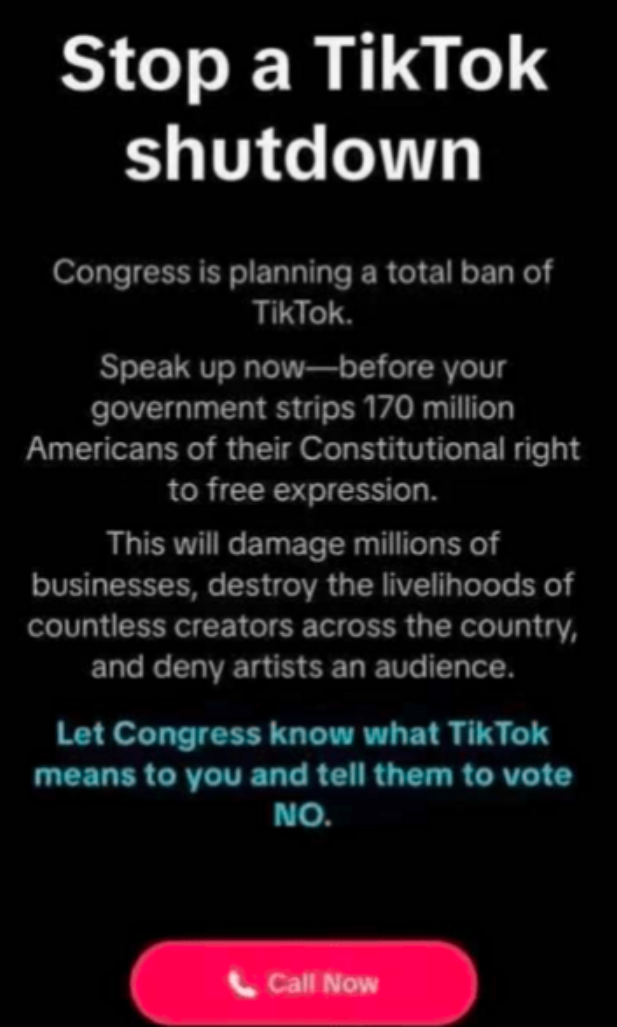 TikTok则选择了向用户求助,TikTok为1.7亿美国用户推送了一则开屏弹窗,号召他们给所在地区的国会议员打电话,要求撤销针对TikTok的剥离法案。为防止用户无法准确找到所在地区的议员,TikTok还很贴心地在弹窗下方准备了入口,用户只需入五位数的Zip Code,即可显示该区的议员办公室电话。不出意料地,这些议员的电话都打爆了。据CNN报道,一位众议院的工作人员表示,他们甚至不得不拔掉电话线才能维持正常工作。