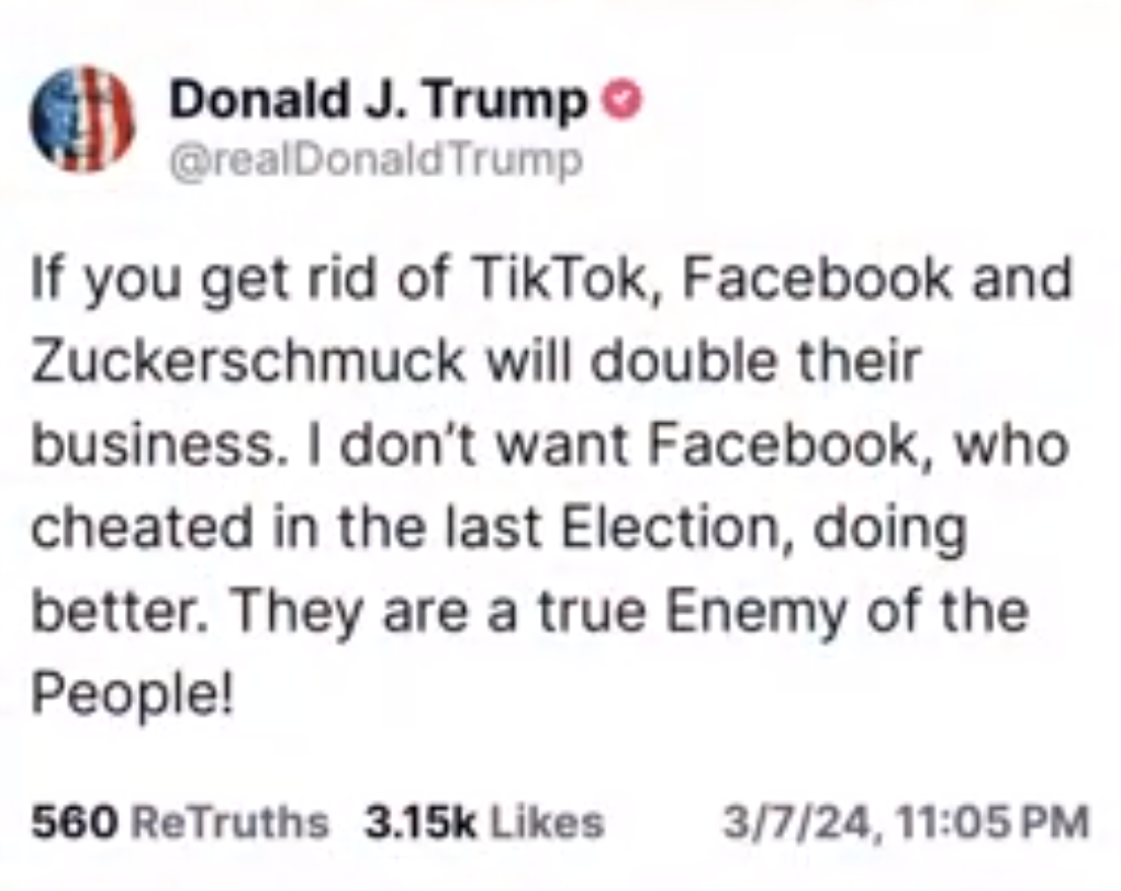 此前一直致力于封禁TikTok的前总统唐纳德·特朗普在Truth Social上发文:”如果取消TikTok,Facebook和扎克伯施米特(指马克·扎克伯格)的业务将翻番。我不想Facebook在上次大选中作弊的人做得更好。”虽然特朗普这次比较反对封禁TikTok,但共和党似乎也不太买账,据Semafor报道,众议院领导层仍计划于下周三就该法案进行投票表决,通过这一加速程序需要三分之二的票数。