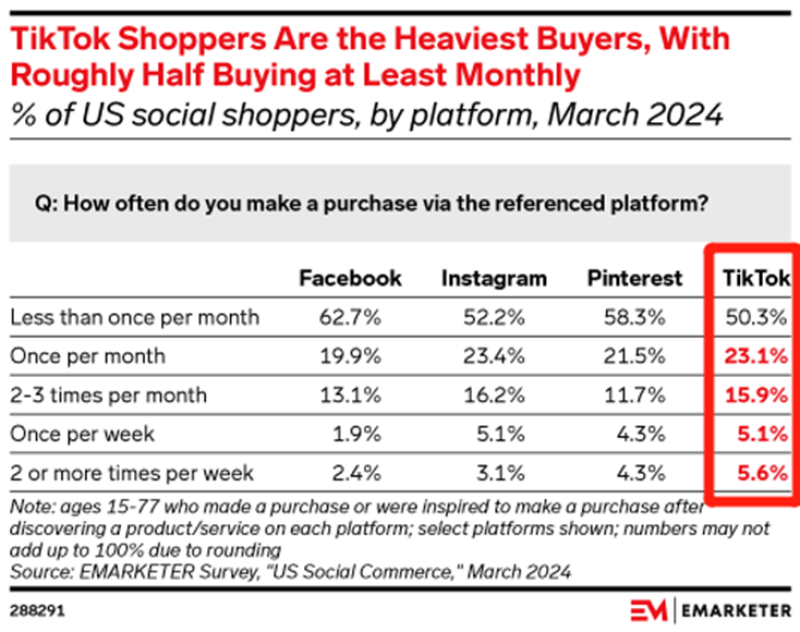 从数据角度看,根据市场研究机构EMARKETER的最新数据,TikTok Shop消费者的购物频率仍高于其他社交平台,超过5%的用户每周都会在TikTok Shop上购物。也就是说,TikTok Shop依然是美国社交电商消费者的主要购物平台。