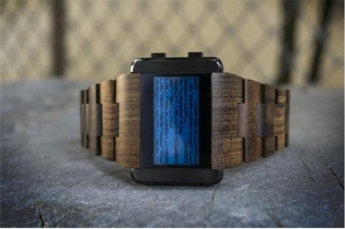 这块手表配备了一块液晶显示屏和不锈钢表壳,同时表带采用了多种百分之百纯天然的木质材料。同时关于液晶显示屏的底色也提供了三个不同的设定,分别是蓝色、绿色和粉色,与黑色的不锈钢表壳和木质表带搭配起来非常漂亮。