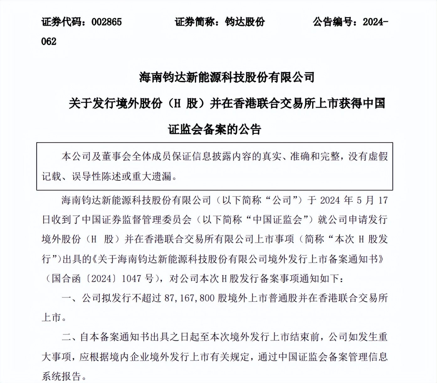 5月19日,3个月前曾向港交所递交IPO申请书的A股标的——钧达股份(002865.SZ)(以下统称“钧达新能源”)发布最新公告显示,其于2024年5月17日收到了证监会关于其港交所IPO备案获批的通知。