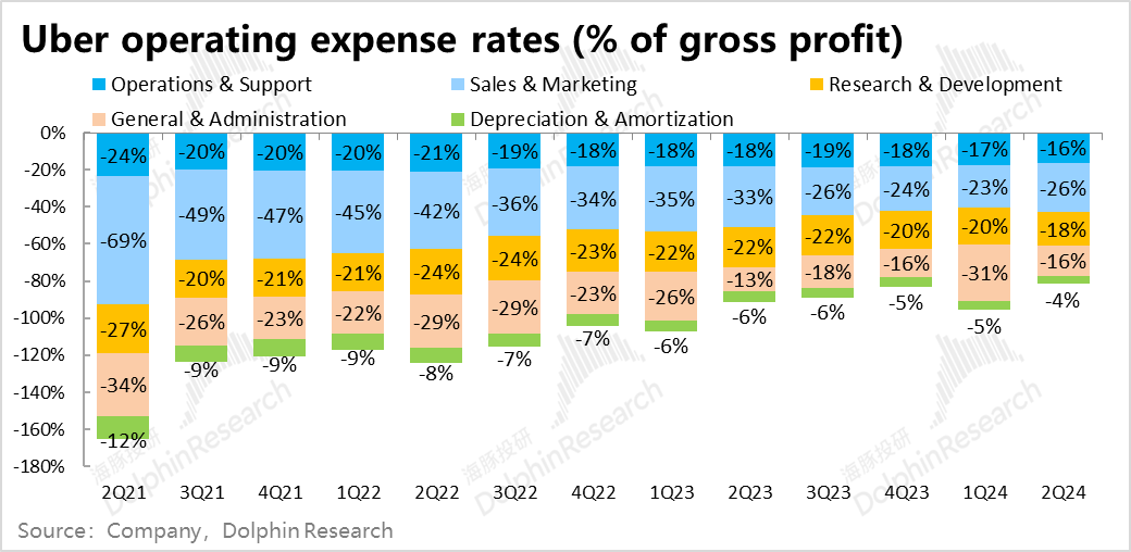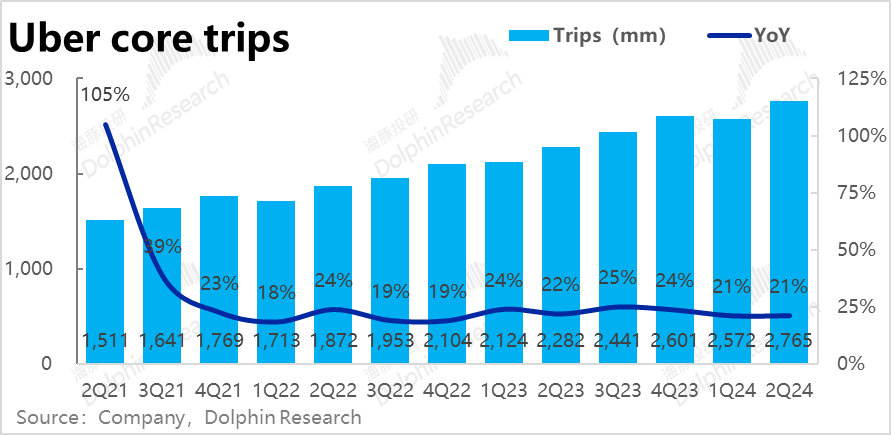 但不看预期差,虽然总费用金额已重新增长,但依旧属于被更快的收入增长摊薄的趋势内。加回股权激励和其他非现金支出的调整后,Uber本季调整后的经营利润为近$14亿。调整后经营利润率达13.1%,较上季提升了1.3pct。