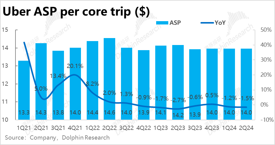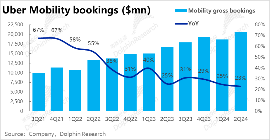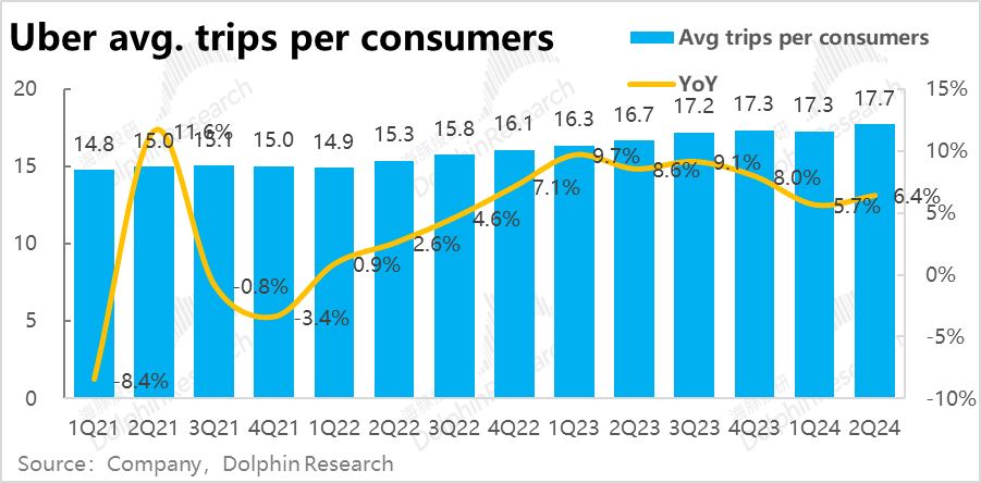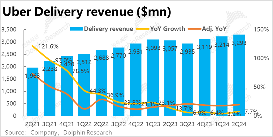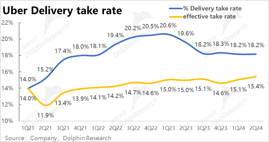 外卖业务本季的收入为32.9亿,同比增长8%,较上季提速了4pct。收入加速增长,主要归功于变现率的走高。剔除1P、3P模式变更的影响,本季的可比变现率为15.4%较上季提高了0.3pct。海豚投研认为,外卖业务变现率的走高,主要是归功于Uber广告业务的增长。据公司披露,广告收入目前的年化收入已达$10亿,不过,市场对外卖业务的预期更高(可能是对广告业务更乐观),导致实际的外卖收入反而是比预期低1.4%。