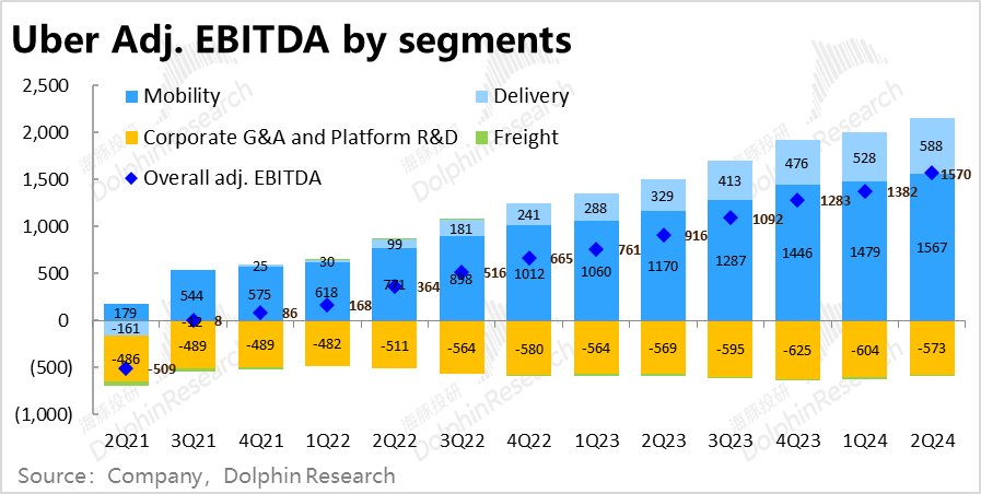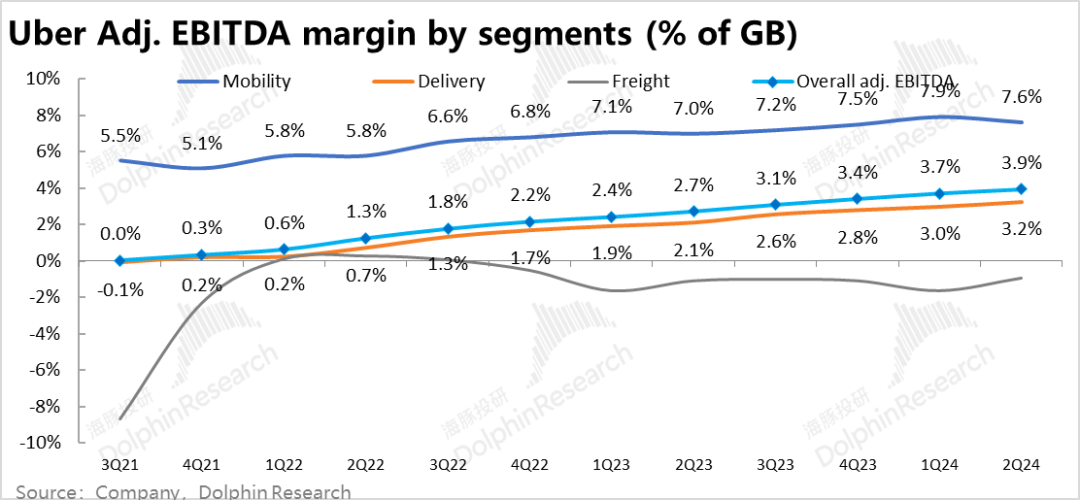 公司更关注的调整后EBITDA指标本季则为15.7亿,比预期略多0.7亿,各业务细分来看:1)打车业务的adj.EBITDA为15.7亿美元,比预期高近0.3亿,但占订单金额的利润率是环比下降了0.3pct的。2)外卖业务实现adj.EBITDA 5.9亿,比预期高近5%,是各板块中最超预期的。占订单额的利润率环比提升了0.2pct;3)至于货运业务,本季度亏损扩大到0.12亿,比预期亏损少0.01亿,但无关大局;4)集团总部层面的亏损为5.7亿,环比有所缩窄。最终集团整体adj.EBITDA占总订单额的比重环比由3.7%提升到3.9%,利润率继续提升。