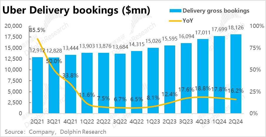 类似的Uber eats外卖业务本季订单金额约181亿元,和预期基本一致。同比增长了17.8%,虽也看似环比放缓了1.6pct,但剔除汇率影响后,实际增速是环比持平的。换言之,Uber的外卖也未出现放缓的迹象。