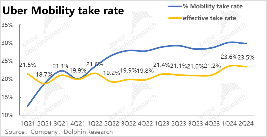 由于Uber在英国和加拿大等地区的部分业务因法律原因,从平台型转变为自营模式,公司确认的营收也从净佣金变为总付款金额,导致营收有所放大,因此下文多数都从剔除会计变更影响后的表现来分析。基于小超预期的订单金额增长,打车业务因变现率比预期稍高,营收跑赢预期的幅度扩大到了2.9%。打车业务的营收增速为25.3%,同比放缓近5pct,但剔除汇率影响后实际仅放缓了2pct。剔除1P、3P模式变更的影响,可比变现率本季为23.5%较上季仅略微下0.1pct。在业务量增速基本走平的情况下,平台的抽成也无明显的变化。