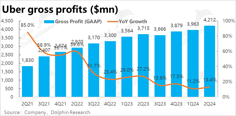 4、Uber本季度总营收107亿美元。预期差的角度,主要归功于打车业务的超预期,总收入比预期多了约2亿。从增速的角度,因外卖业务变现率提升,剔除汇率影响后总收入的增速反而环比提速了2pct到17%。毛利同比增长13.4%较上季提速2.2pct,和收入的提速幅度基本一致,并略高一些。也是归功于外卖业务广告收入促成的变现率提升。