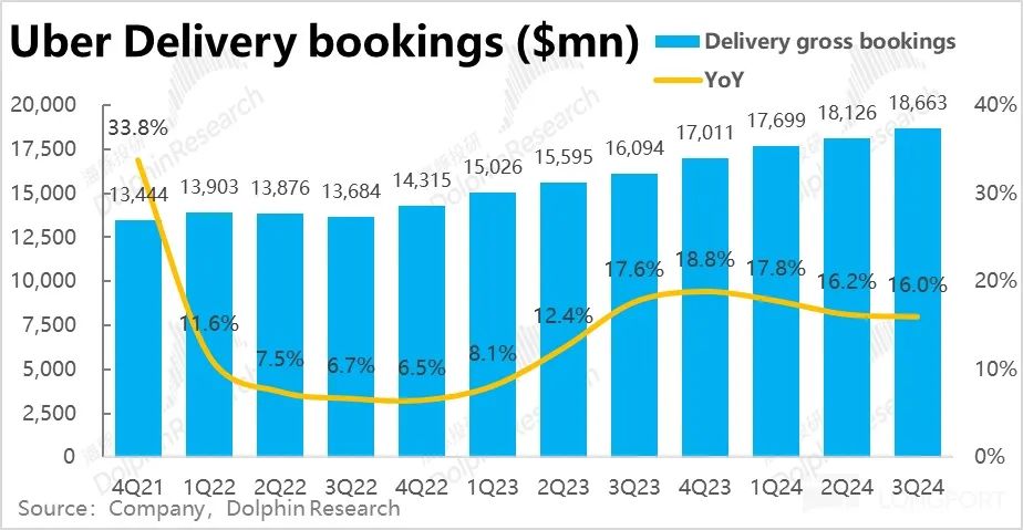 而Uber eats 外卖业务本季订单金额约 187 亿元,同比增长了 16%,相比上季度增速基本持平没有放缓,因此也是略超市场预期的。这也符合某些高频数据展示出外卖需求相对更坚韧的情况。