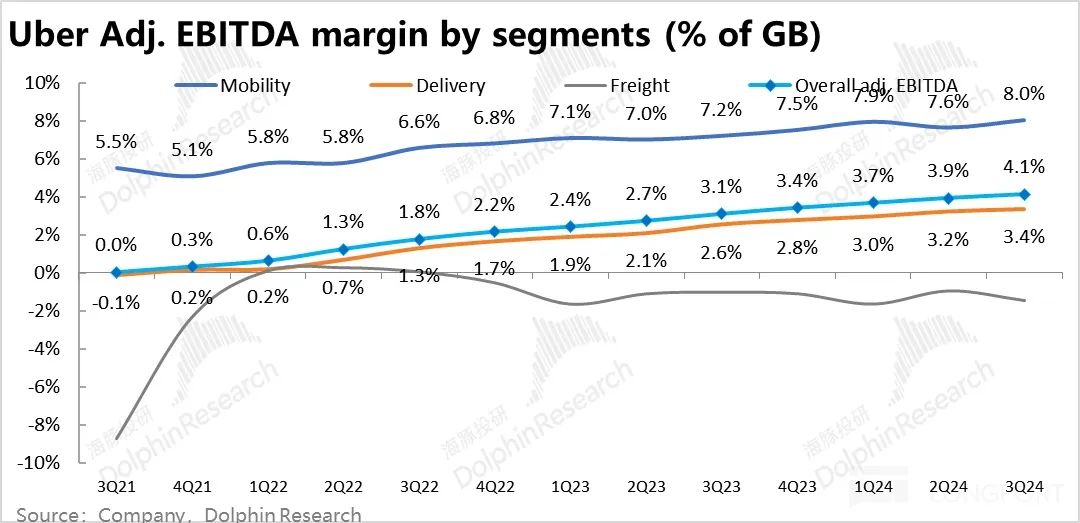 1)打车业务的 adj.EBITDA为 16.8 亿美元,比预期高近 0.5 亿,但虽然调整后 take rate 是下降的,但利润占 Gross booking 的比重仍是环比提升 0.4pct 到 8%。