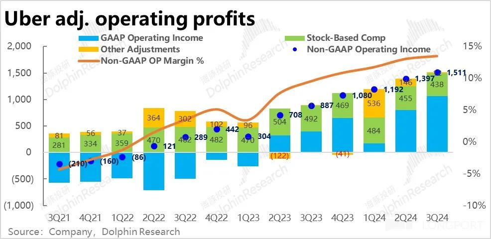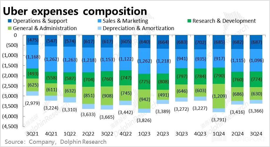 由于公司的收入口径并不稳定,持续变动。导致毛利/收入比重的指标不完全可比。因此,我们也主要关注毛利润额的增长情况。本季毛利同比增长 20.8%,较上季大幅提速了 7.4pct。 虽然由上文可见,本季度收入口径的调整在 GAAP 口径下夸大了营收的增速。但逻辑上收入口径的调整对毛利并不会有明显影响,因此从毛利来看,Uber 调整后变现率的下滑并没影响到公司自身的盈利,即便也有压力也向下传导到了司机或商户身上。
