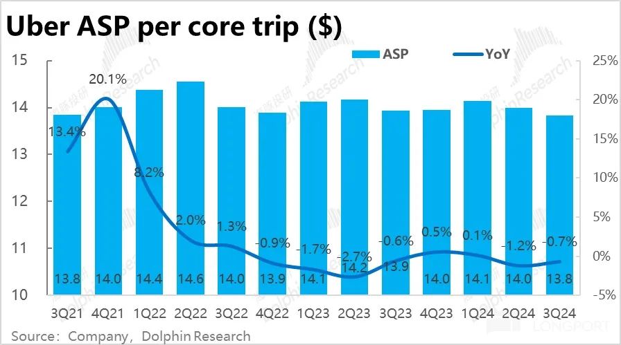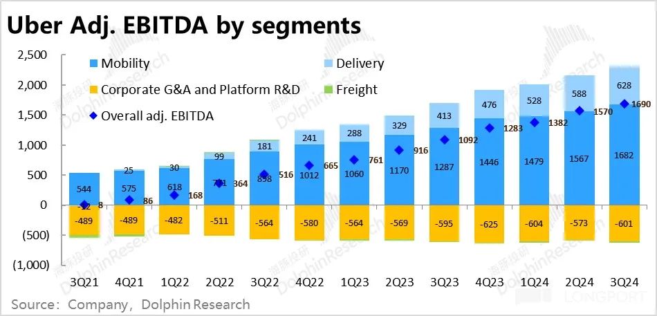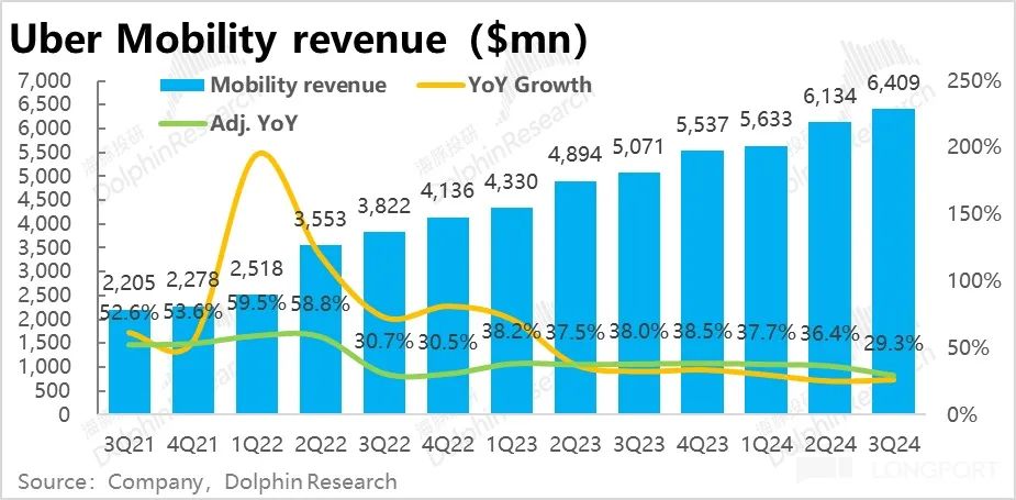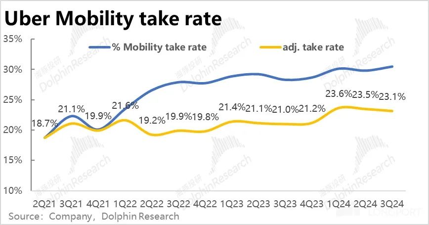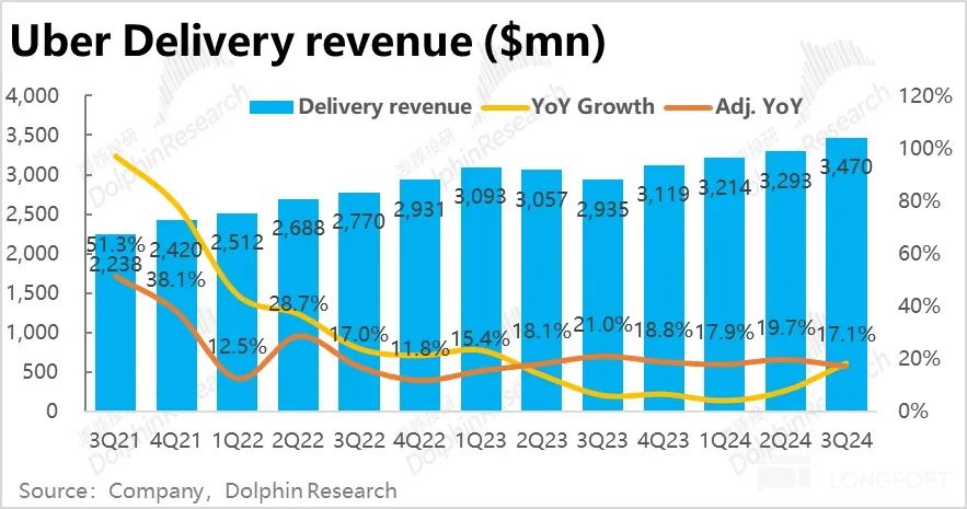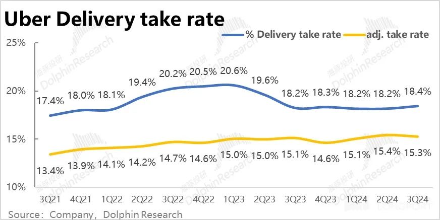 调整后外卖业务本季的变现率也环比略降了 0.1pct,有点在海豚投研的意料之外。照理目前随着 Uber eats 广告业务的发展,变现率应当是有持续走高趋势的。因此收入增速也小幅放缓了 2.6pct,不过还算是可接受的范围内。
