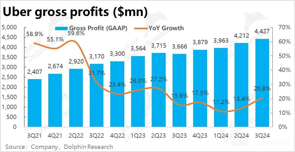 3、然而又一个反转是,虽然订单量增长放缓,调整后可比的变现率也都环比走低。但本季毛利额同比增长 20.8%,较上季大幅提速了 7.4pct。且逻辑上收入口径的变更对毛利并不会有多少影响,毛利的增长是 “真实可靠” 的。可见,Uber 调整后变现率的下滑并没影响到公司自身的盈利,即便感受到了一些竞争压力,公司也有能力向下传导到司机或商户身上。