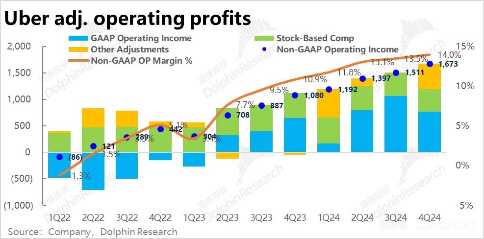 因此在毛利率大体持平,费用端剔除管理费用计提的影响后,除营销费用有所增长外,其他费用都基本没有增长,被增长的收入体量摊薄。本季度调整后的经营利润大约$16.7 亿,经营利润率(占收入比重)继续小幅改善。