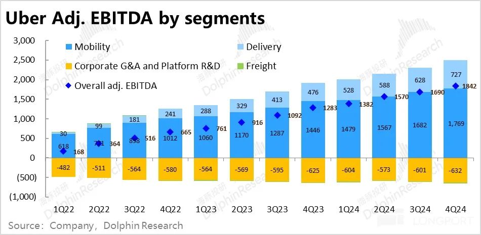 外卖业务则由于高于预期的订单额增长,以及环比提升的变现率,adj.EBITDA 约$7.3 亿,比预期高约 6%,占 gross booking 的利润率也环比提升了约 0.2pct,对冲了网约车业务的绝大部分影响,使得公司整体的利润和预期差异相当有限。