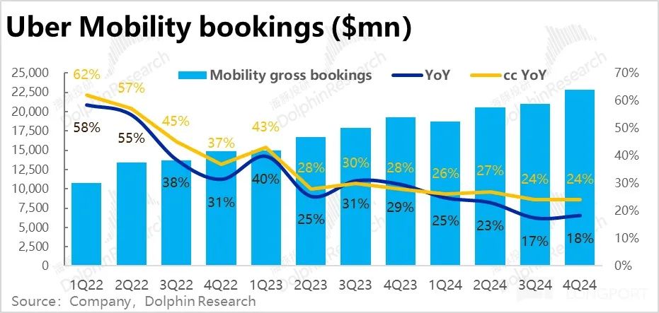 1、最关键的订单额指标(Gross booking)本季的表现实际不错,网约车(Mobility)业务,订单额同比增长 18.2%,明显高于上季度的 17.3% 和市场预期的 16.8%。剔除汇率影响后,可比增速为 24% 也和上季度完全一致。
