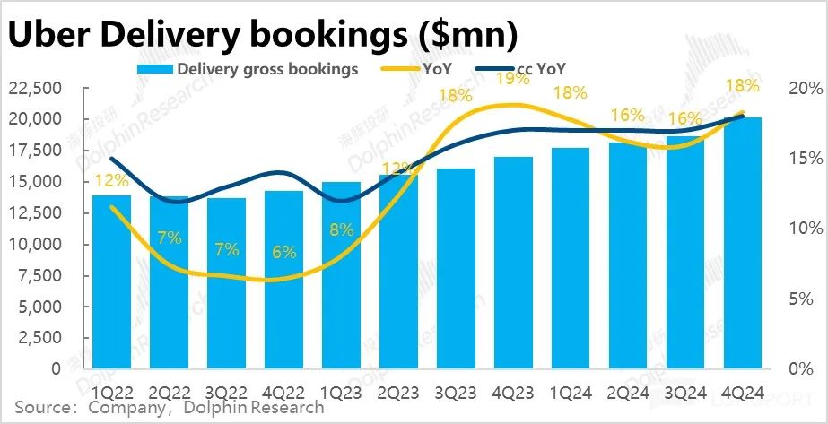 类似的,Uber eats 外卖业务本季订单金额同比增长了约 18%,较上季度提速约 2.3pct,即便剔除汇兑影响的利好,不变汇率下增速同样提升了 1pct。外卖业务的增长反而是在走强的,明显高于市场预期 15.8% 的增速。