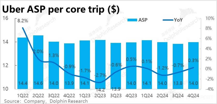 1)主要是网约车业务的 adj.EBITDA 不及预期,为 17.7 亿美元,比预期低约 0.4 亿。占 Gross booking 的利润率为 7.8% 低于市场预期和上季度的 8%。结合上文提及的网约车业务的变现率环比下降,营销支出也明显增长,市场可能把网约车业务的利润率下滑理解为了在包括自动驾驶的竞争对手冲击下,竞争格局的恶化。
