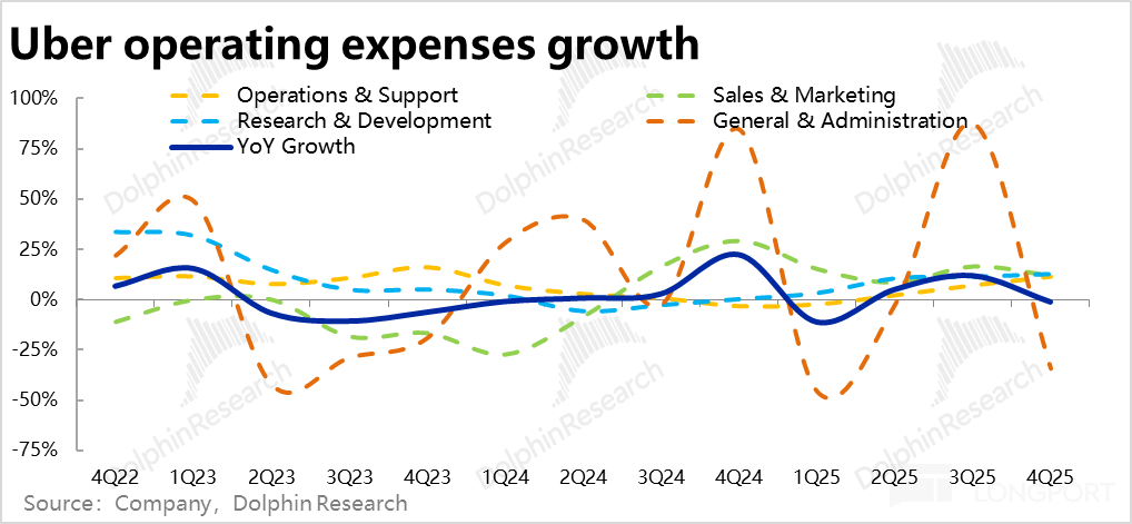 分价量驱动因素看,Uber 的核心订单额顶着不算太好的宏观消费环境、加速增长,仍主要是靠更健康的量的增长。本季核心业务订单量同比增长 22.3%,环比持平在高位。同时,平均客单价也同比扭跌转涨了 0.7%。