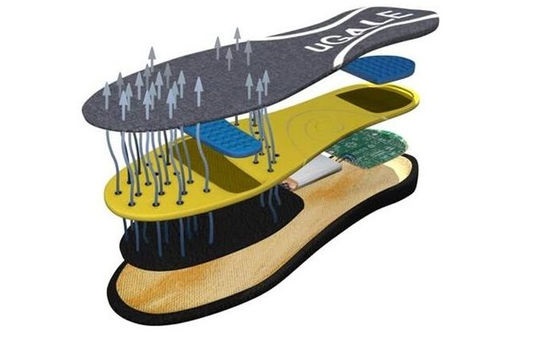 uGale是一款由App控制的鞋垫,它可以让你的双脚凉爽、让你的鞋通风无异味,也可以让你的双脚暖和起来。uGale通过把空气吹送到鞋的死角部位来防止出汗和臭脚。其中的想法就是通过降低容易滋生细菌的地方的湿度,来让你的双脚保持干爽。