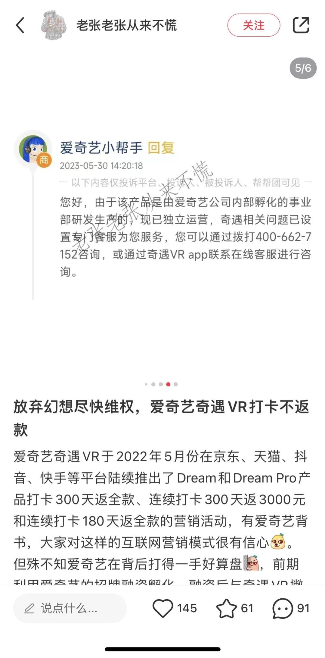 无独有偶,部分参加了奇遇VR打卡活动但却无法获得返现的用户,在网络上进行投诉时也收到了类似的回应。