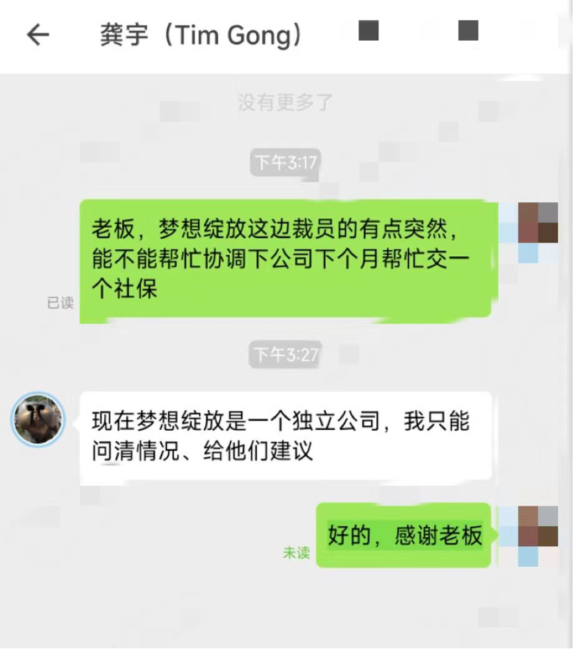 还有一些梦想绽放的员工联系龚宇,希望能够解决工资拖欠的问题,但得到的回复也大都相似,龚宇上来就强调了爱奇艺和梦想绽放是两个独立的主体,爱奇艺只能给予建议和帮助。
