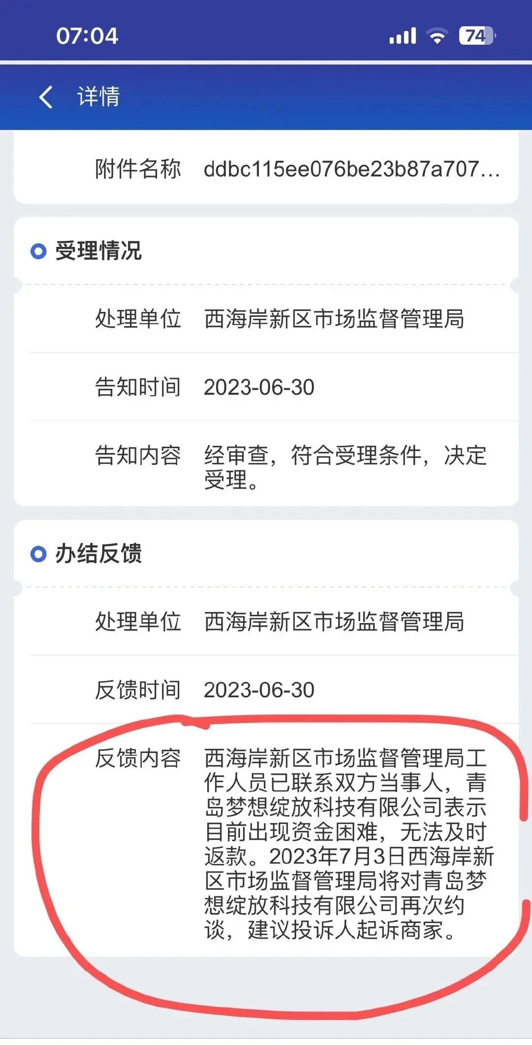 为此,已经有不少用户欲通过起诉获得返款,还有用户将此事投诉至当地市场监督部门,获得的回复则是“青岛梦想绽放科技有限公司表示目前出现资金困难,无法及时返款”;“建议投诉人起诉商家”。