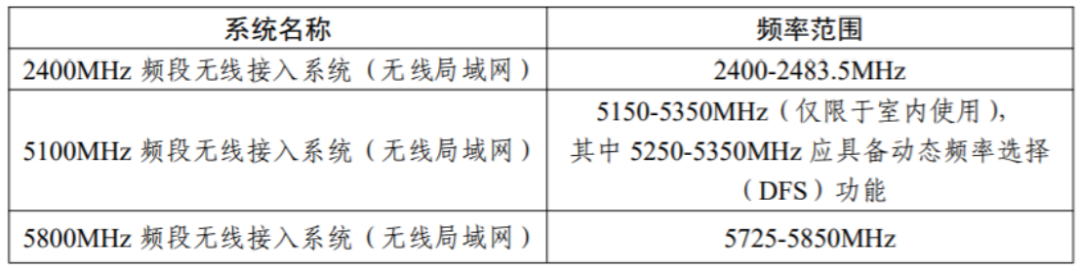 目前,WiFi在2.4GHz和5GHz频段已非常拥挤,急需扩大频段范围,而WiFi在国内可用频段资源更少。根据最新发布的《工业和信息化部关于加强和规范2400MHz、5100MHz和5800MHz频段无线电管理有关事宜的通知》,WiFi可用频段资源主要包括以下范围: