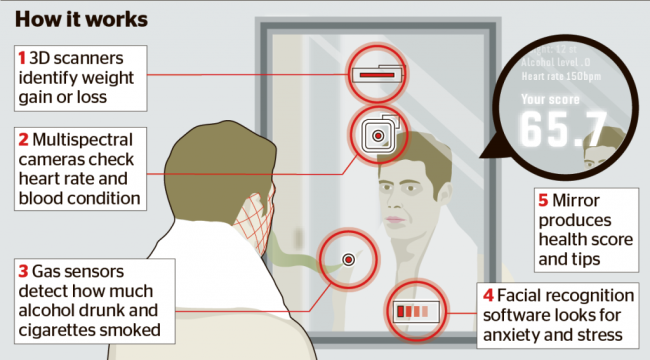 Wize Mirror健康智能镜通过内置3D扫描仪来扫描用户近期的体重变化,而面部识别软件则可以分辨你现在的情绪是否有紧张、焦虑等情况。此外气体传感器将会通过检测你呼出的气体来分辨你是否抽了烟或者喝了酒。多光谱摄像头可以测量你的心跳以及血液中血红蛋白的含量。